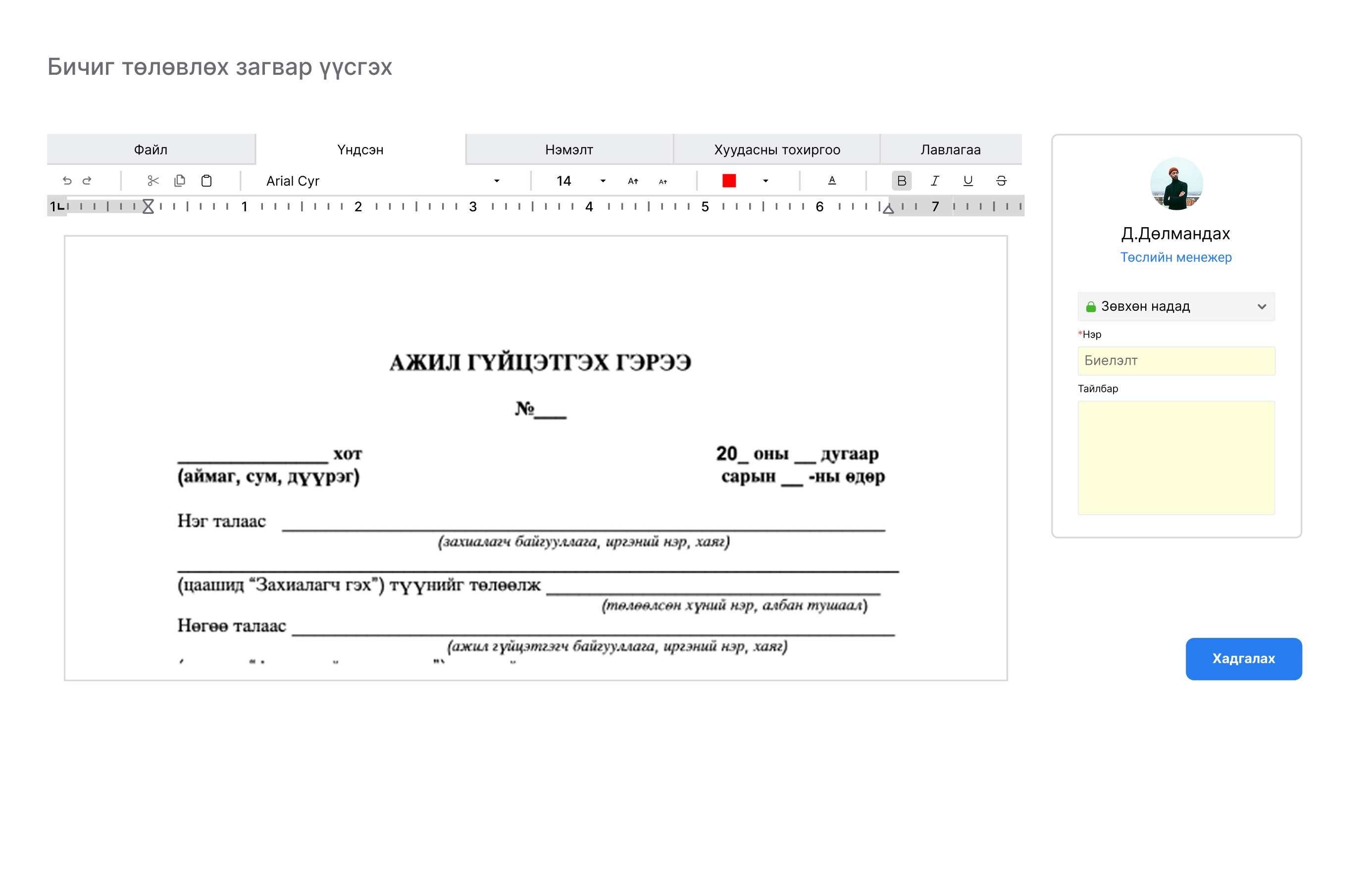 Гэрээг стандартын дагуу боловсруулах, хянуулахаар болон батлуулахаар илгээх, засварлах, батлах, санал өгөх, файл хавсаргах хадгалах боломжтой